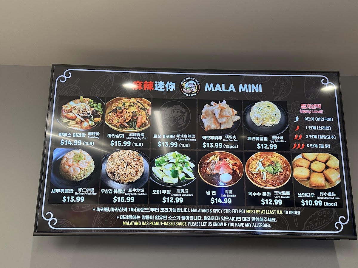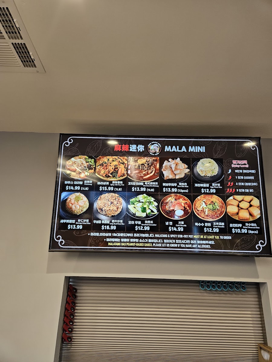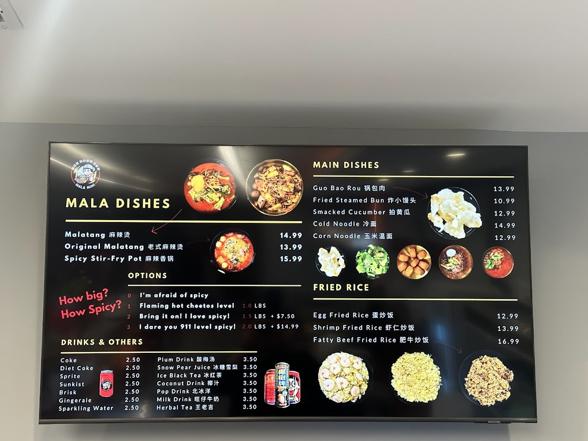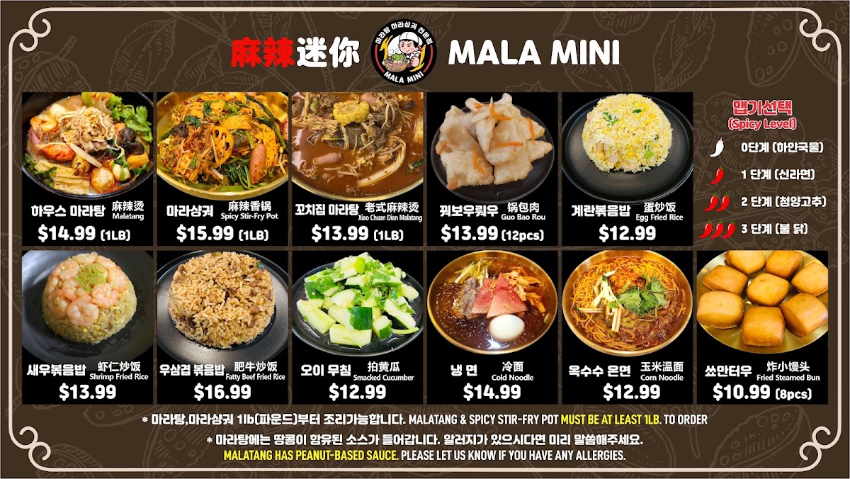 The menu at Mala Mini offers a delightful selection of spicy and savory dishes that cater to a variety of tastes. Their House Malatang is a standout with options available in 1 LB for $11.99, 1.5 LB for $13.99, 2 LB for $15.99, and 2.5 LB for $17.99. For those craving a bit more heat, the Spicy Stir-Fry Pot at $12.99 per pound is an excellent choice. The restaurant also features a range of other main dishes like the crispy and flavorful Guo Bao Rou (12pcs) at $13.99, and comforting rice options such as Egg Fried Rice for $8.99, Fatty Beef Fried Rice for $11.99, and Shrimp Fried Rice for $12.99. Additionally, they offer Xiaolongbao (7pcs) for $8.99, perfect for those craving delicate dumplings. To wash it all down, you can enjoy a variety of soft drinks like Coke and Diet Coke, as well as refreshing Boba options such as Black Milk Boba, Taro Boba, Mango Boba, Strawberry Boba, and the trendy Tiger Sugar Boba, each adding a sweet touch to your meal. With its well-priced and flavorful menu, Mala Mini offers a satisfying dining experience for anyone in the mood for bold, spicy flavors and comforting classics.